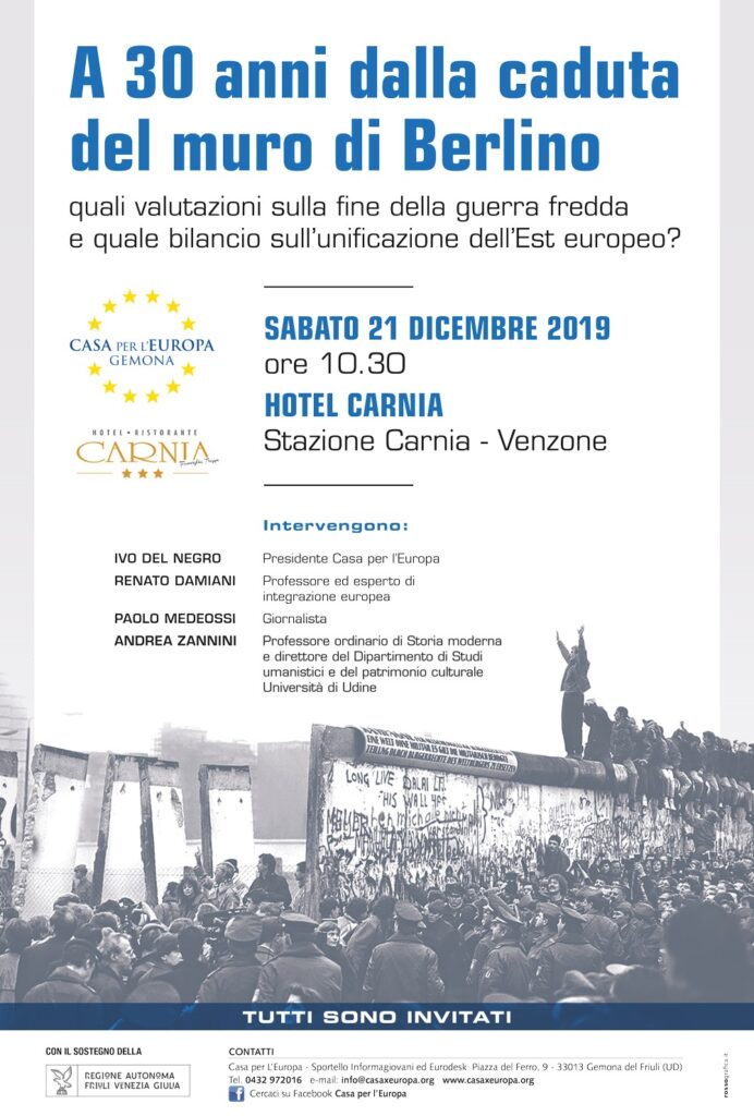 “A 30 anni dalla caduta del muro di Berlino, quali valutazioni sulla fine della guerra fredda e quale bilancio sull’unificazione dell’Est europeo?”, di questo e molto altro si discuterà al convegno organizzato dalla Casa per l’Europa sabato 21 dicembre ore 10.30 presso l’Hotel Carnia di Stazione Carnia, Venzone.