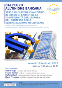 Venerdì 19 febbraio la Casa per l’Europa organizza, in collaborazione con l’Università degli Studi di Udine, il convegno dal titolo Dall’Euro all’Unione Bancaria: verso un sistema finanziario in grado di garantire la competitività dell’Europa nel contesto della globalizzazione multipolare.