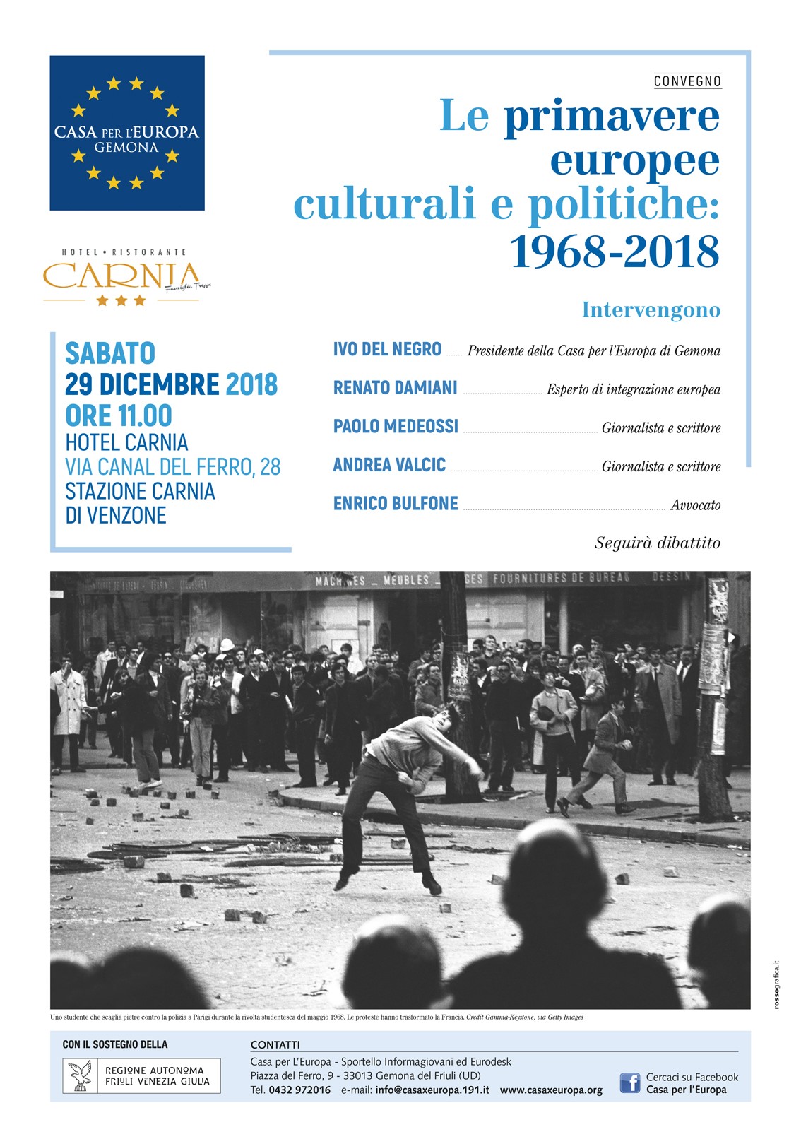 La Casa per L’Europa col sostegno della Regione Friuli Venezia Giulia, organizza sabato 29 dicembre 2018 ore 11.00 presso l’Hotel Carnia a Stazione di Carnia di Venzone il convegno “Le primavere europee culturali e politiche: 1968 – 2018“. Interverranno: