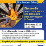 Il prossimo webinar, dal titolo “DiscoverEu – scopri come vincere uno dei 60.000 pass per viaggiare in Europa” si terrà Mercoledì 6 Ottobre 2021 dalle ore 16:00 alle 17:00 e sarà condotto da Giovanni Maccioni (Eurodesk Italy).