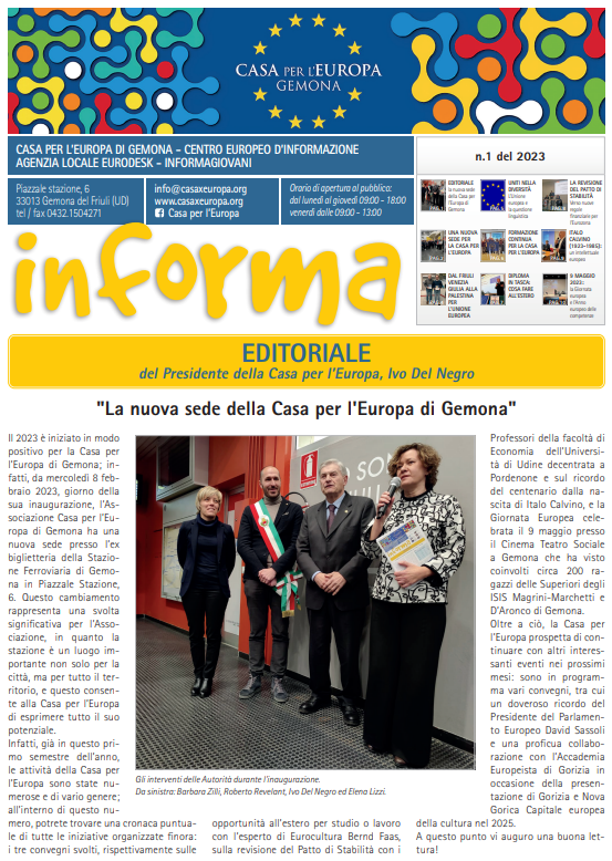 Nel primo numero del 2023 trovate le ultime novità della Casa per l’Europa, tra cui particolare rilievo assume la notizia del cambio di sede dell’Associazione, che a inizio anno si è trasferita dal Centro Storico, dove da una quindicina d’anni aveva il proprio ufficio in Piazza del Ferro, ai locali dell’ex biglietteria della Stazione ferroviaria in Piazzale Stazione, 6. Un’occasione storica e una svolta molto significativa per l’Associazione che ora andrà a operare in un punto nevralgico e strategico non solo del Comune, ma dell’intero territorio, mirando così a proporre le nostre attività con un respiro veramente internazionale.
