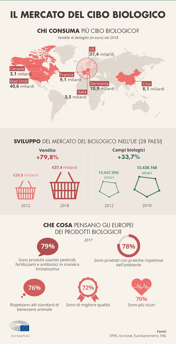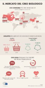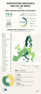 Il mercato biologico dell’UE si è costantemente ampliato fino a raggiungere oggi un valore di circa €37.4 miliardi all’anno. Nonostante negli anni i terreni agricoli dedicati alla produzione biologica siano aumentati, questi rappresentano ancora solamente circa il 7,5% di tutti i terreni coltivabili. Per quanto riguarda l’Italia, la percentuale di terreni agricoli destinati al biologico arriva al 14%. Il divario tra domanda e offerta è colmato dall’aumento delle importazioni.