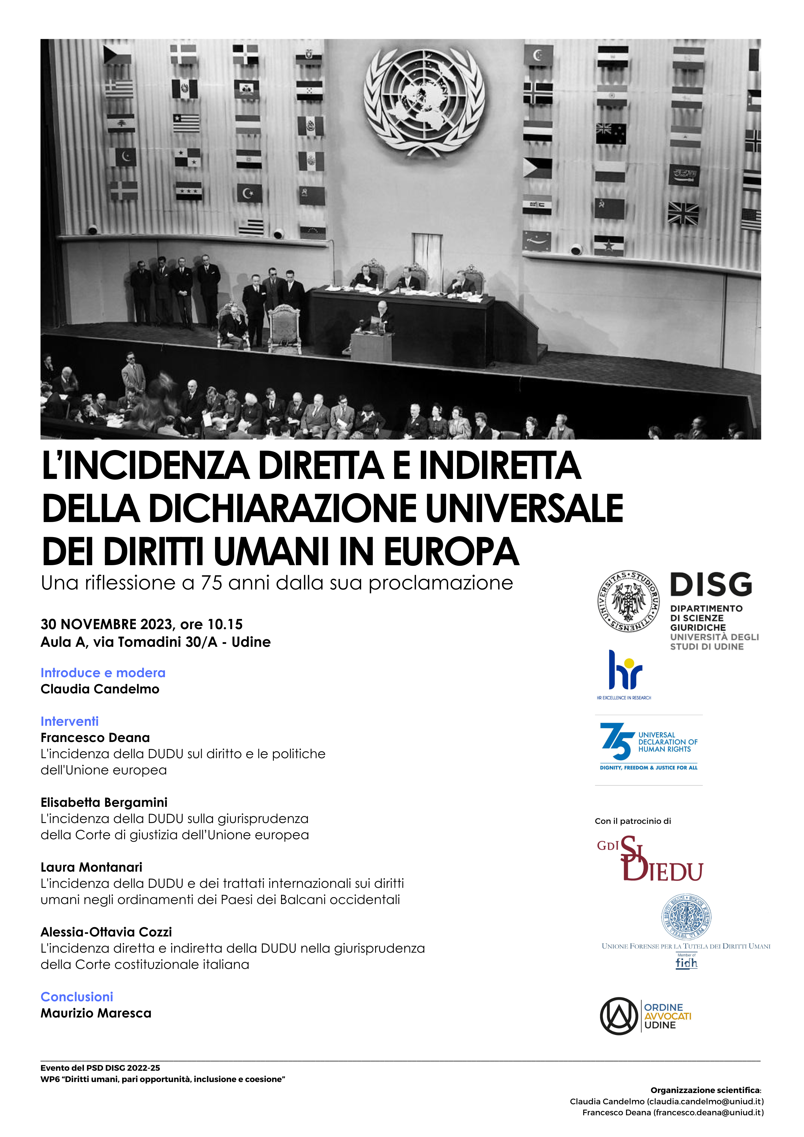 In occasione del 75esimo anniversario della proclamazione della Dichiarazione Universale dei diritti umani, i Professori dell’Università di Udine Claudia Candelmo e Francesco Deana stanno organizzando presso l’Università di Udine un seminario dal titolo “L’incidenza diretta e indiretta della Dichiarazione Universale dei Diritti Umani in Europa“. Come si può notare dal titolo del seminario e delle singole relazioni, l’evento si focalizzerà in particolare sull’impatto della Dichiarazione in Europa (intesa come UE e come Stati che ambiscono ad aderire all’UE). In un momento in cui i diritti fondamentali sono messi sempre più in discussione, anche (purtroppo) a casa nostra, una riflessione sul tema diventa più che doverosa. L’evento si svolgerà, nello specifico, giovedì 30 novembre 2023 a partire dalle ore 10.15 presso l’Aula A in Via Tomadini 30/A a Udine e tutti sono invitati a partecipare.