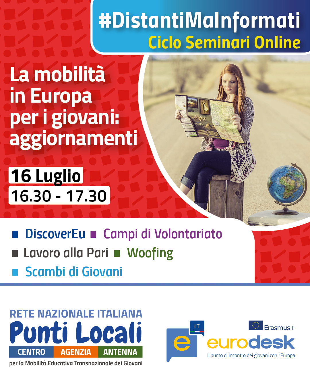 Il prossimo appuntamento, l’ultimo prima della pausa estiva, si terrà Giovedì 16 Luglio 2020, dalle 16:30 alle 17:30, sul tema “La Mobilità in Europa per i giovani: aggiornamenti” e sarà condotto da Giovanni Maccioni, (Ufficio di Coordinamento Nazionale Eurodesk Italy).