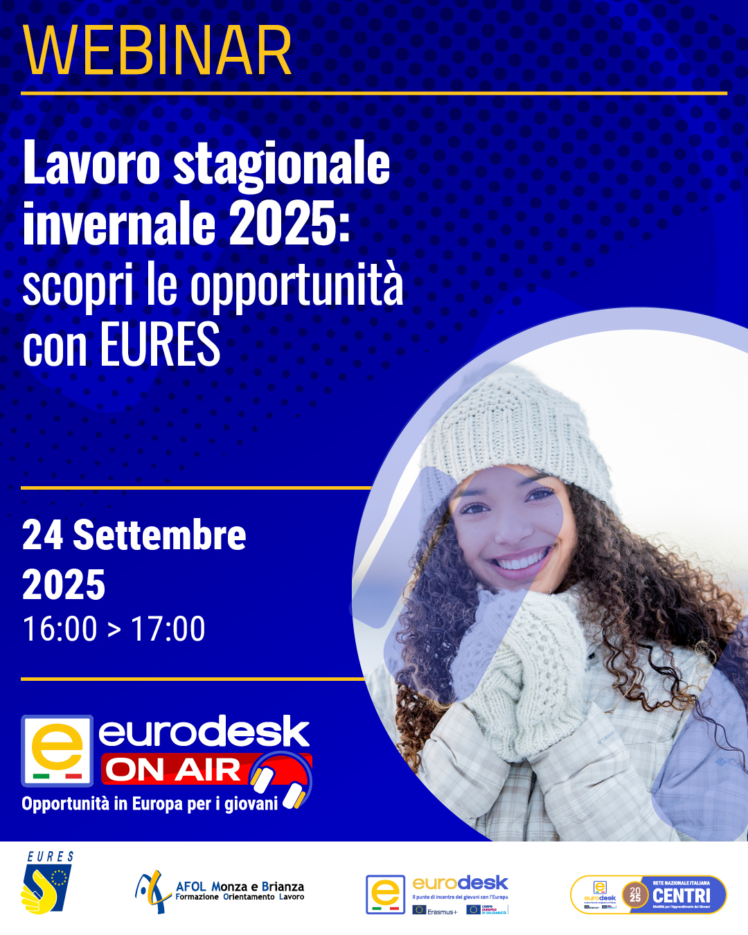 Il prossimo appuntamento si terrà Mercoledì 24 settembre 2025, ore 16:00>17:00 sul tema “Lavoro stagionale invernale 2025: scopri le opportunità con EURES” e sarà condotto da Fabrizio Rossetto (EURES ADVISER – Afol Monza Brianza).